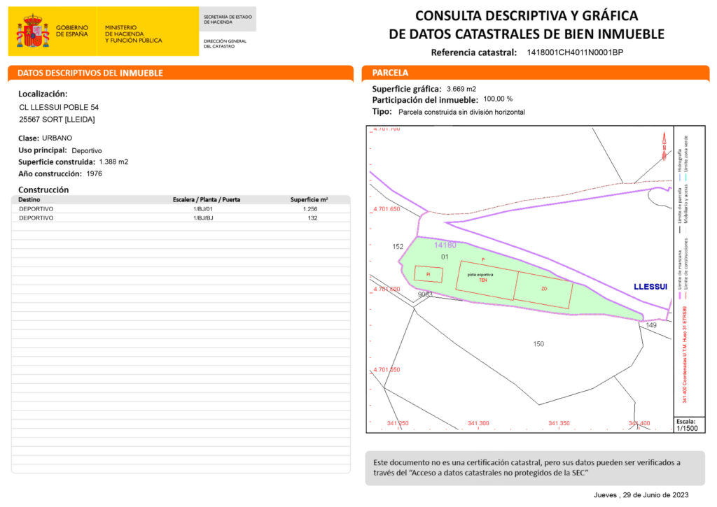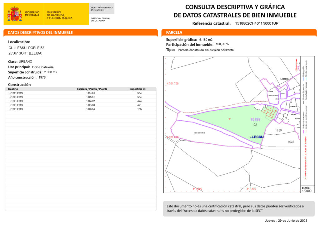 Es ven antic Hotel Can Massa, a la població de Llessui (Vall d’Àssua), del municipi de Sort. Es compon d’edifici destinat a Hotel de 2008 m2 construïts, un terreny edificable davant d’aquest, actualment destinat a esbarjo infantil i un altre terreny també edificable, on avui s’ubiquen equipaments esportius (pista de frontó/tennis, piscina i pista de futbol), tot dins dues finques de 6180 m2, i 3669 m2 respectivament. Interior de l’hotel a reformar totalment. Els exteriors es troben en bon estat, incloent-hi la teulada. Bon accés. Zona tranquil·la. Vistes magnífiques. Possibilitat de canvi dús.