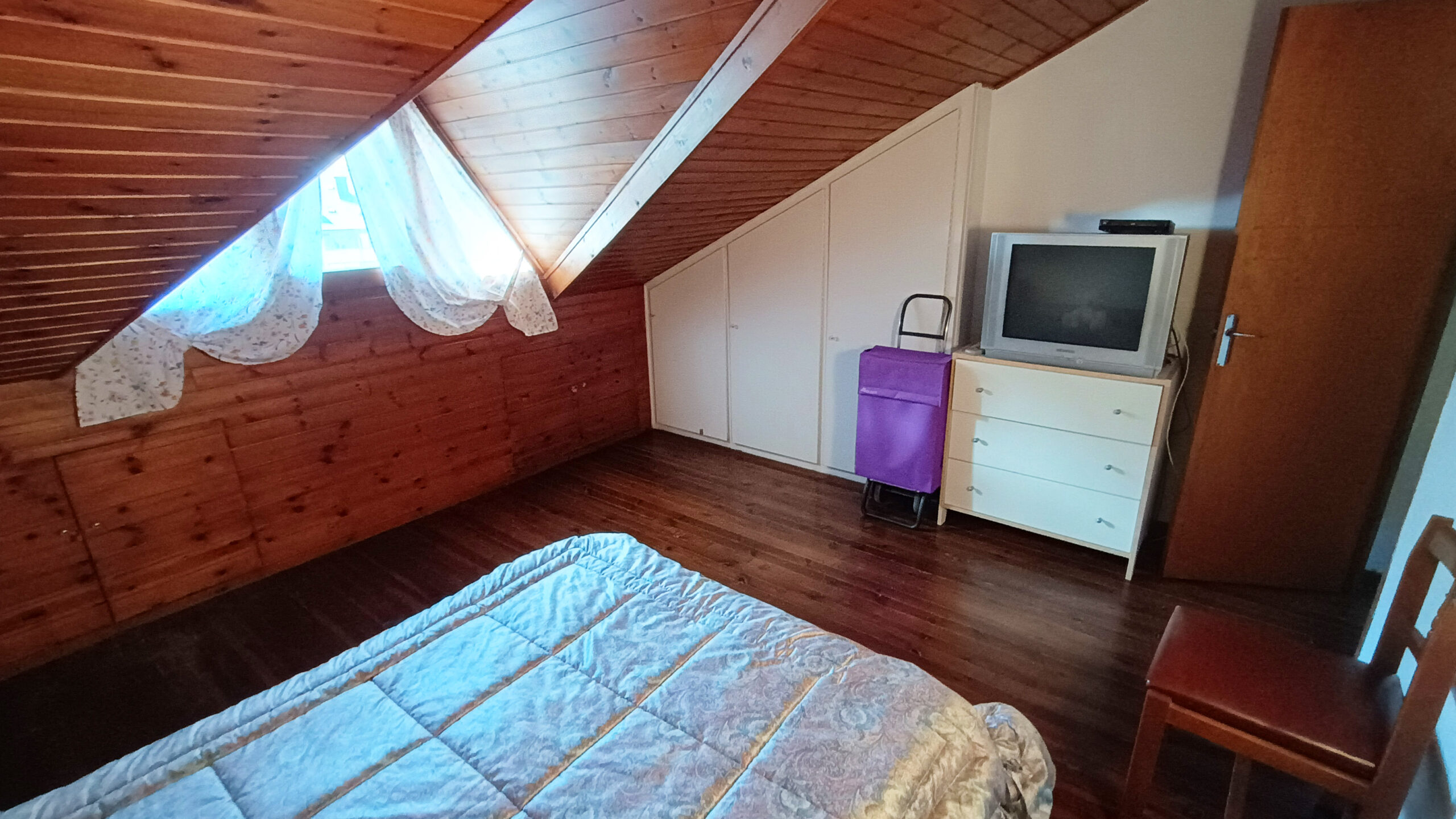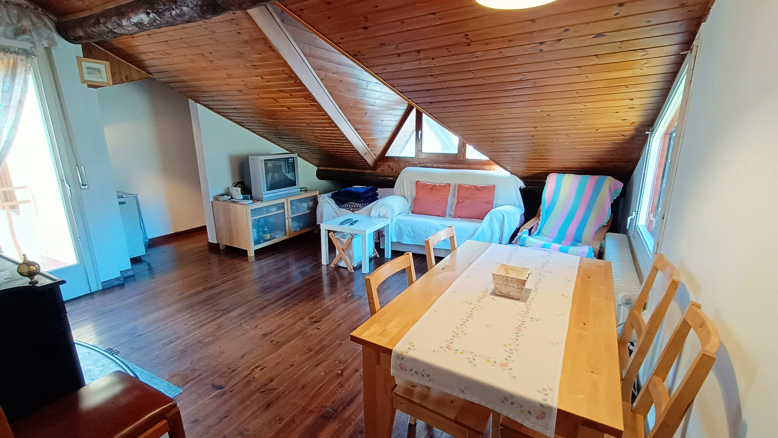 En venda àtic rústic a la població de Sort. Disposa de dos dormitoris dobles, cuina independent i exterior, menjador, bany i terrassa. Sòl de parquet, sostre amb golfes de fusta amb finestres tipus “llucana”, armaris encastats i xemeneia. Vistes magnífiques a la població de Sort i al riu Noguera Pallaresa. Molt assolellat i lluminós. És una cinquena planta sense ascensor.