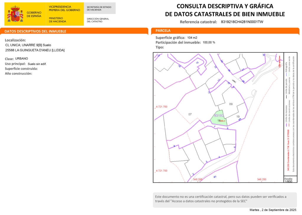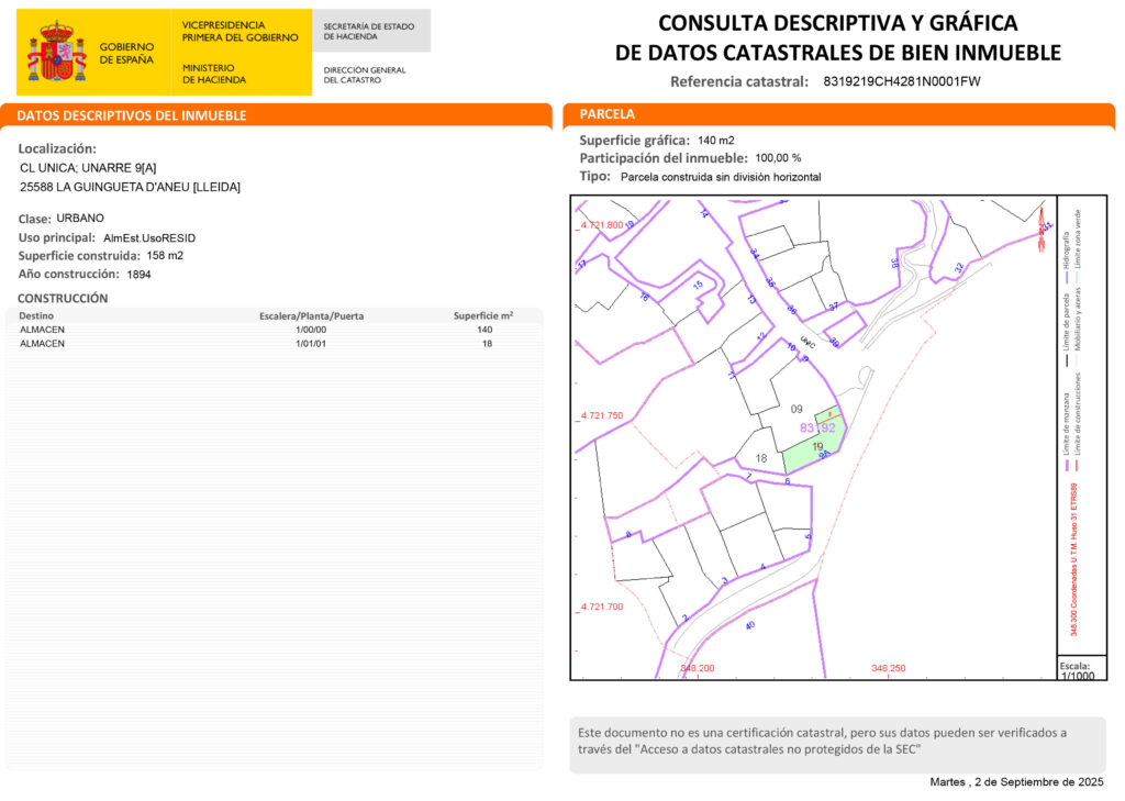 Es venen dues parcel·les contigües al poble d’Unarre, un poble tranquil d’alta muntanya de 15 habitants censats que encara conserva l’autenticitat dels Pirineus: carrers estrets, parets de pedra, teulades de pissarra, la seva església romànica i envoltat de prats al costat d’un riu d’aigües cristal·lines. Situat a 1219 mt. d’alçada i 4 km (7 minuts) per carretera asfaltada d’Esterri d’Àneu (centre geogràfic, econòmic, social i cultural de les valls d’Àneu). A prop de diverses estacions d´esquí com Baqueira-Bonaigua.