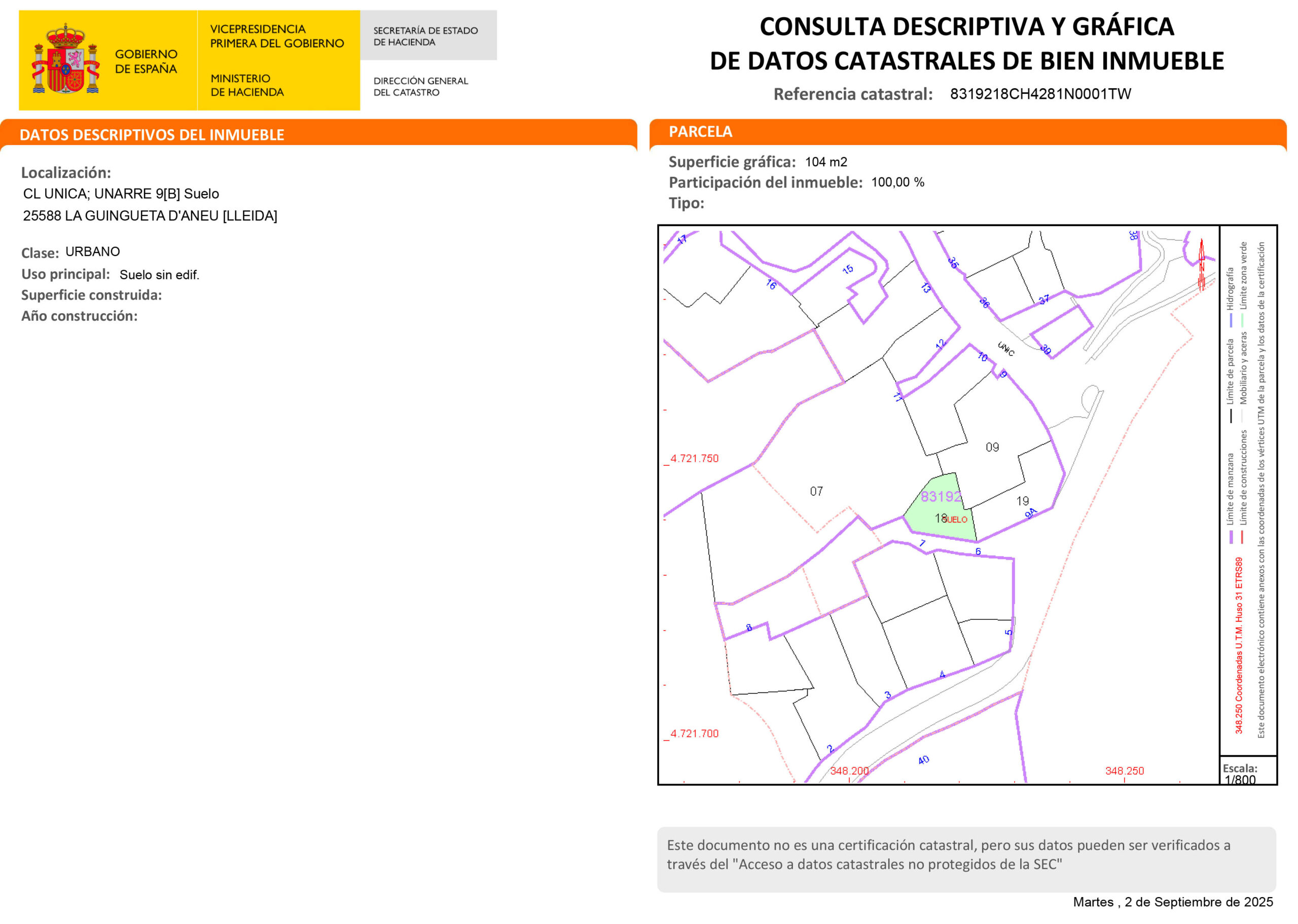 Es venen dues parcel·les contigües al poble d’Unarre, un poble tranquil d’alta muntanya de 15 habitants censats que encara conserva l’autenticitat dels Pirineus: carrers estrets, parets de pedra, teulades de pissarra, la seva església romànica i envoltat de prats al costat d’un riu d’aigües cristal·lines. Situat a 1219 mt. d’alçada i 4 km (7 minuts) per carretera asfaltada d’Esterri d’Àneu (centre geogràfic, econòmic, social i cultural de les valls d’Àneu). A prop de diverses estacions d´esquí com Baqueira-Bonaigua.